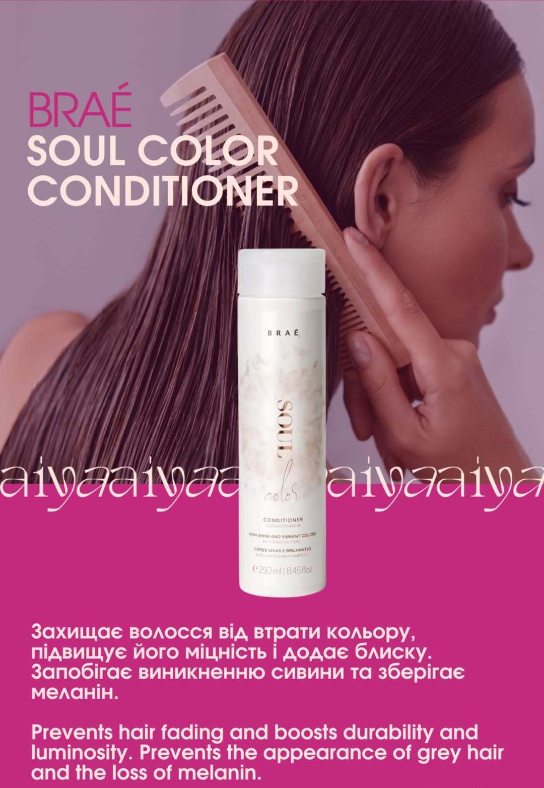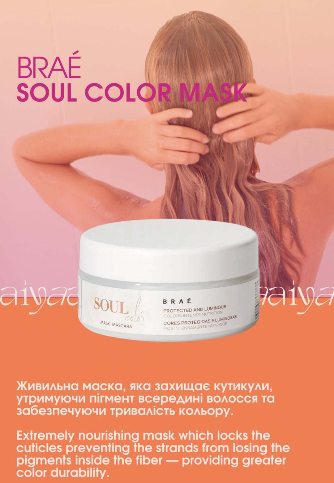 Aiya Beauty Care präsentiert Braé Soul Color – eine einzigartige Haarpflegeserie, die Ihr coloriertes Haar schützt, pflegt und seine Leuchtkraft bewahrt. Vollgepackt mit Antioxidantien, UV-Filtern und einer Mischung aus natürlichen Ölen hilft Soul Color, Feuchtigkeit zu speichern, dem Verblassen vorzubeugen und die Farbbrillanz mit jeder Haarwäsche zu steigern. Die sanften, sulfatfreien Formeln reinigen und pflegen, ohne das Haar auszutrocknen – perfekt für den Erhalt satter, strahlender Töne. Mit Braé Soul Color haben Sie die unverzichtbare Pflegeroutine für weiches, glänzendes und lebendiges coloriertes Haar.